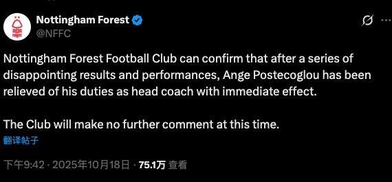 10月18日,诺丁汉森林官方宣布解雇主教练波斯特科格鲁,巧合的是,诺丁汉森林官方公告用了39个单词,正好对应波斯特科格鲁上任39天。